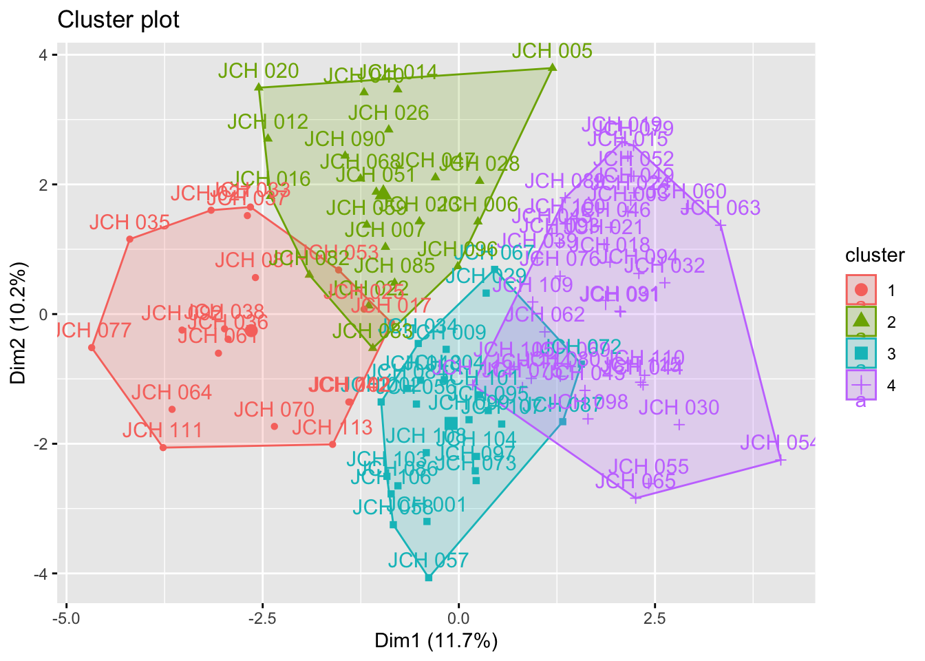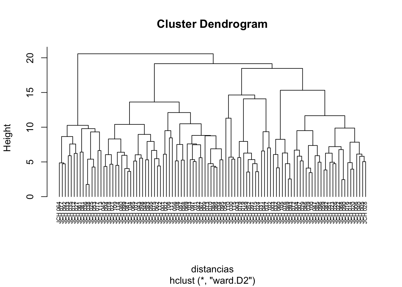 # Cut the dendrogram to form clustersgrupos <-cutree(res.hc, k =4) # Replace 4 with the desired number of clusters