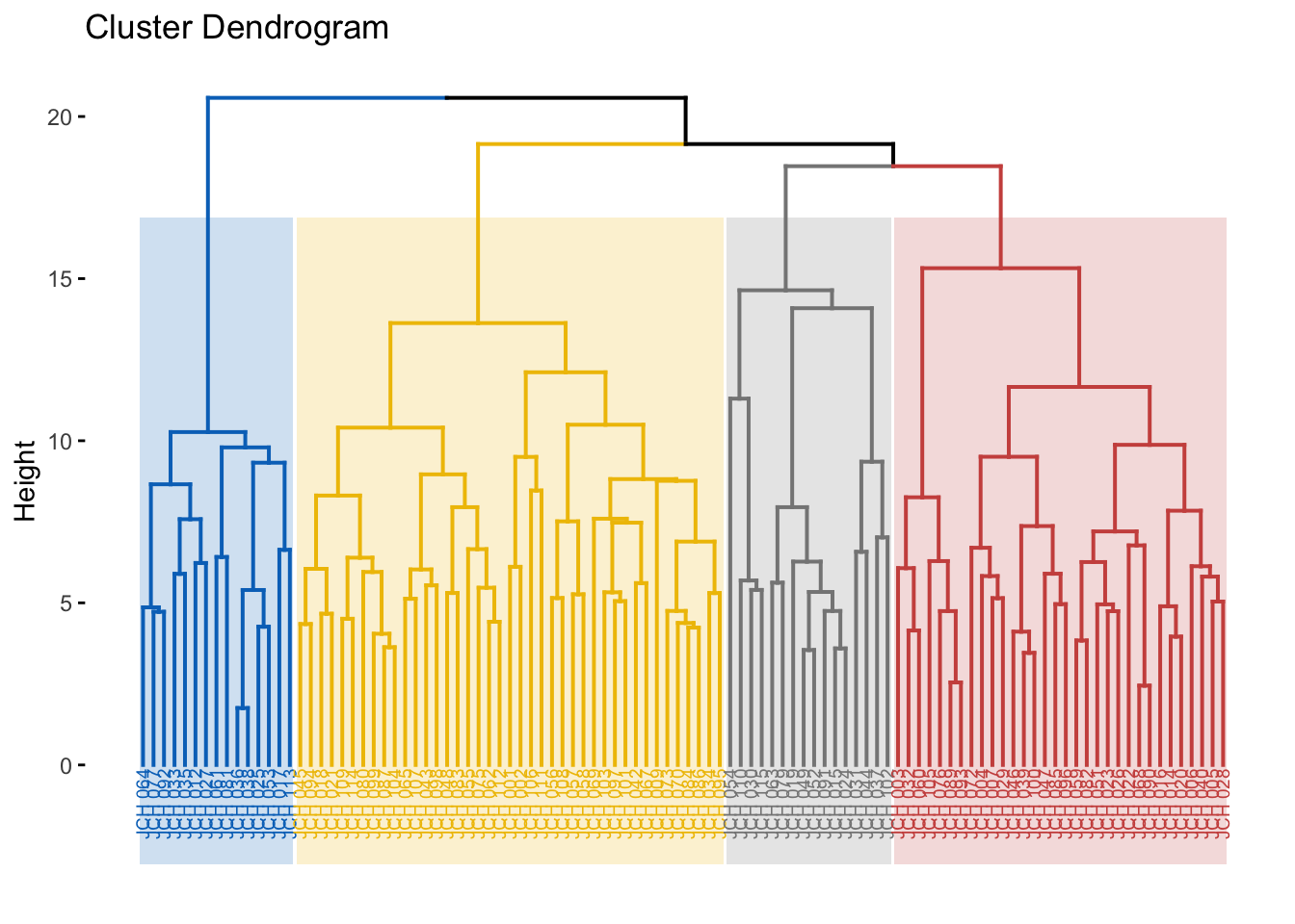 # Visualize dendrogram with colored clustersfviz_dend(res.hc, cex =0.5, k =4, rect =TRUE, k_colors ="jco", rect_border ="jco", rect_fill =TRUE)