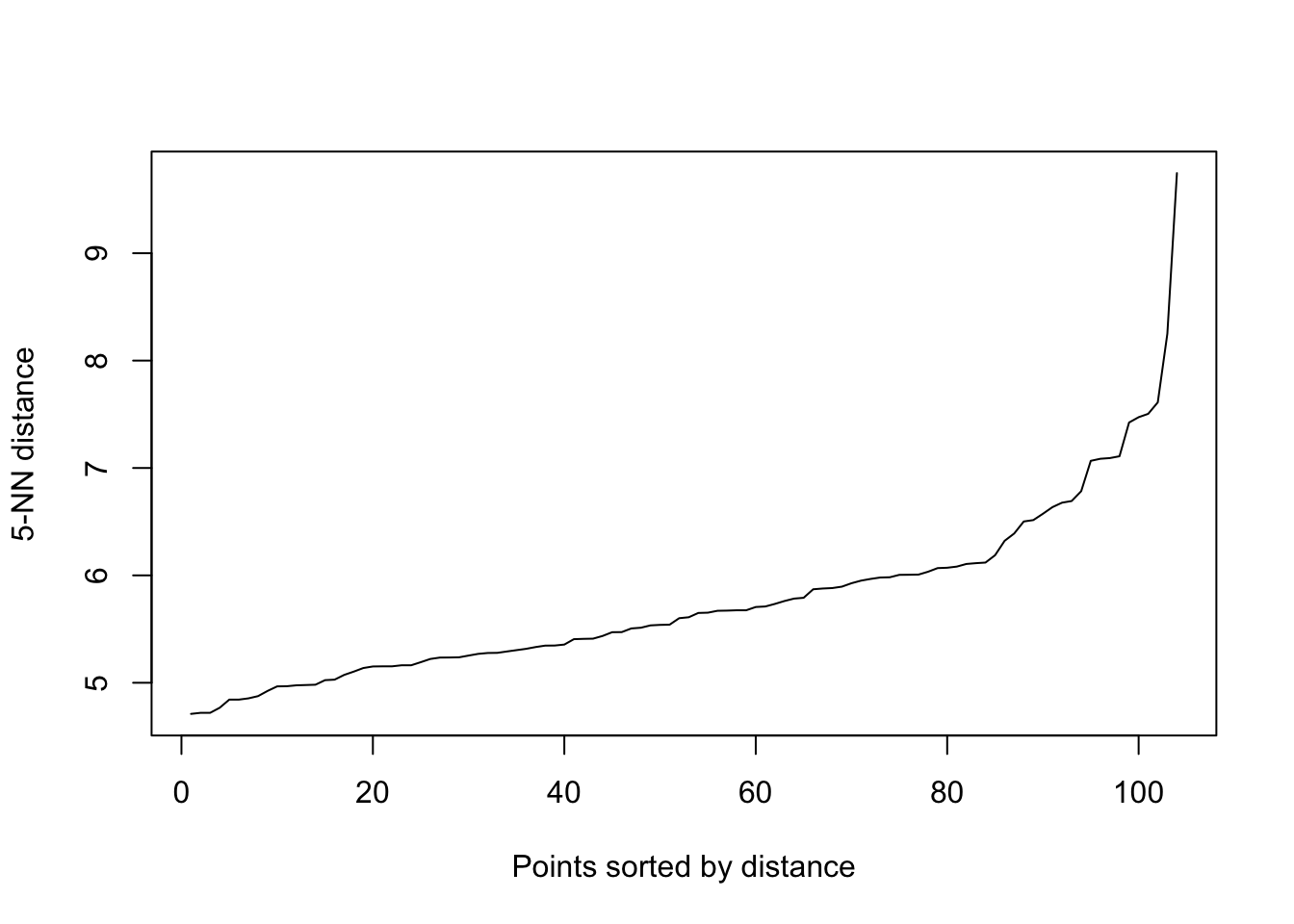 The epsilon parameter controls the neighborhood radius for density estimation. We begin by identifying an appropriate epsilon value through a k-NN distance plot.