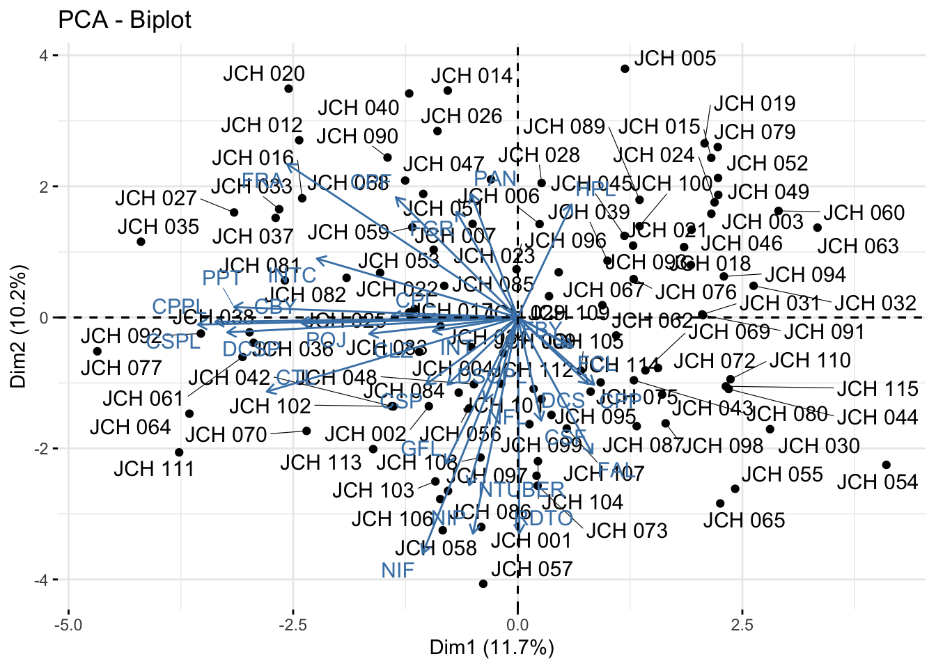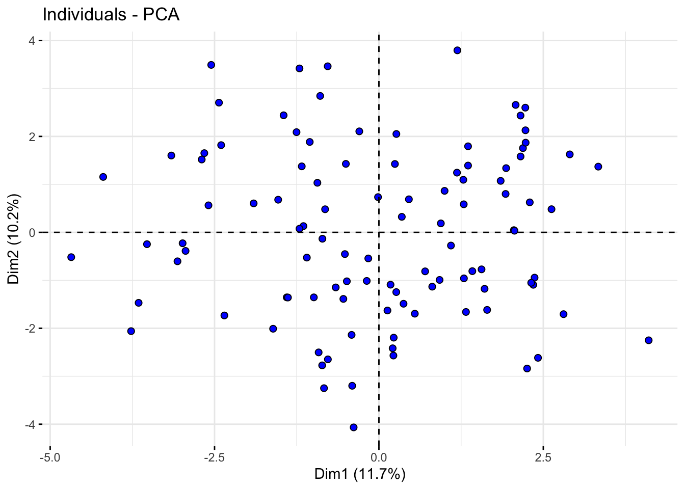 # Plot of individuals in the space of the first two principal componentsfviz_pca_ind(acp_resultados, geom.ind ="point", pointshape =21, pointsize =2, fill.ind ="blue", col.ind ="black", repel =TRUE)