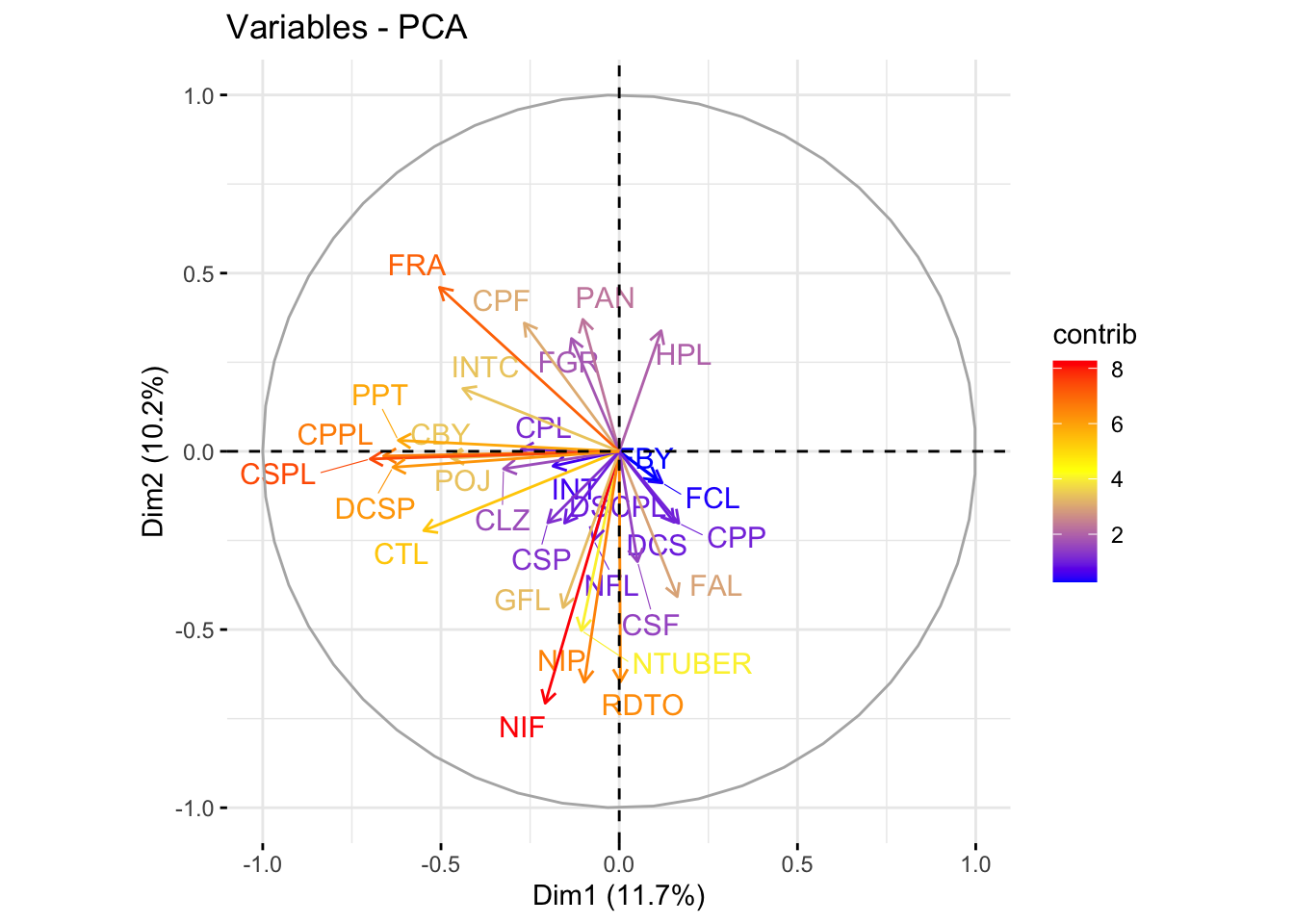 # Plot of variables in the space of the first two principal componentsfviz_pca_var(acp_resultados, col.var ="contrib", gradient.cols =c("blue", "yellow", "red"), repel =TRUE)