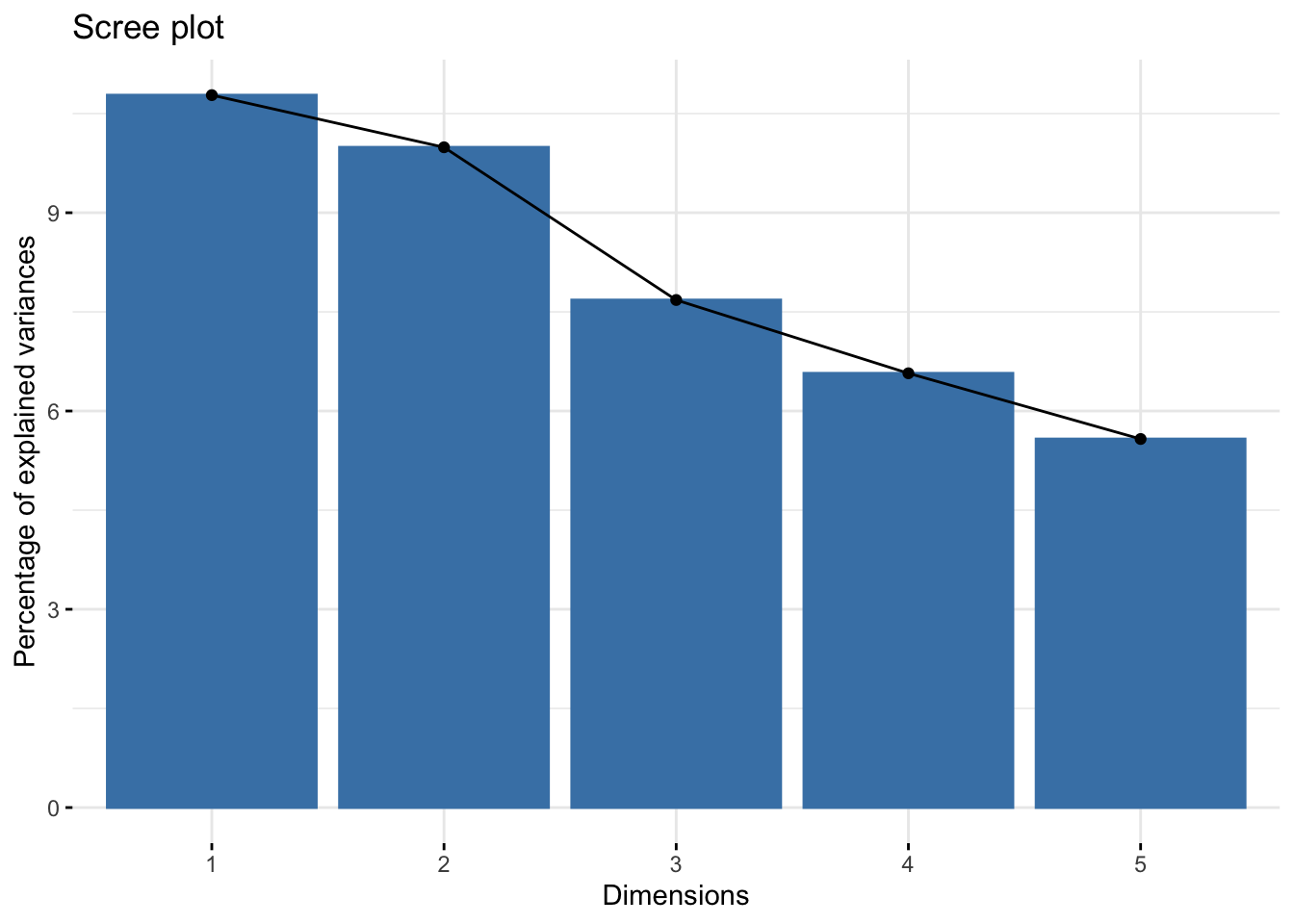 # Scree plot showing the percentage of variance explained by each componentfviz_screeplot(res.famd)