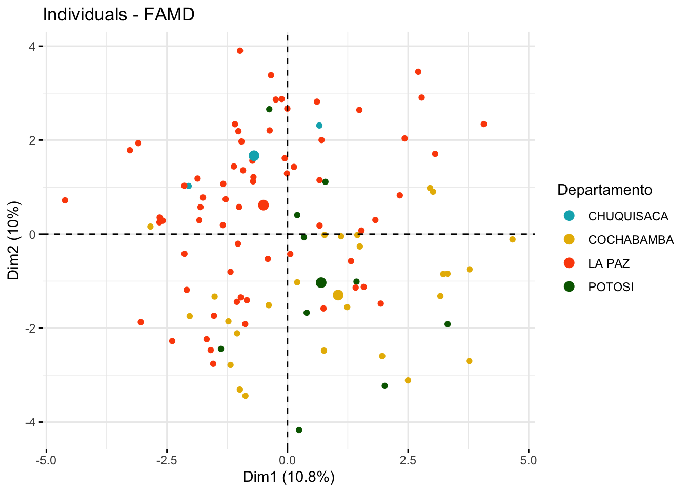 # Visualization of individuals by group with confidence ellipsesfviz_mfa_ind(res.famd, habillage ="Departamento",palette =c("#00AFBB", "#E7B800", "#FC4E07", "darkgreen"),addEllipses = F, ellipse.type ="confidence", repel =TRUE,label ="none" )