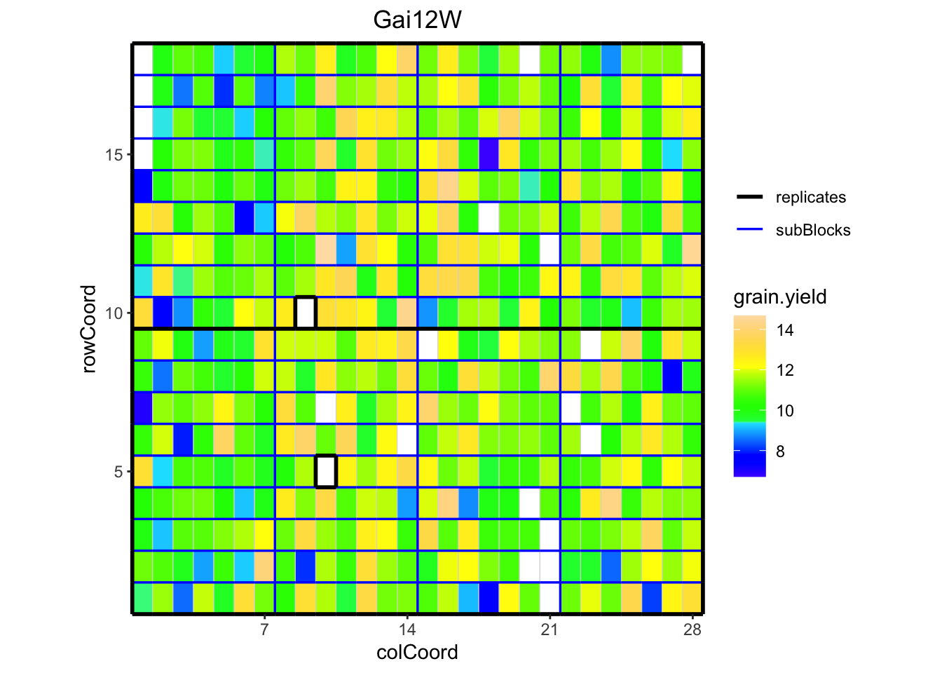 # 1. Cargar la librería# Si no la tienes instalada, ejecuta antes: install.packages("statgenSTA")library(statgenSTA)# 2. Cargar los datos de prueba incluidos en el paquetedata("dropsRaw")# 3. Crear el objeto TD (Trial Data)# Este paso es clave: mapea las columnas de tu Excel/CSV a la nomenclatura estándar del paquetedropsTD <-createTD(data = dropsRaw,genotype ="Variety_ID",trial ="Experiment",repId ="Replicate", # RepeticionessubBlock ="block", # Bloques incompletosrowCoord ="Row", # Coordenadas espaciales de filacolCoord ="Column") # Coordenadas espaciales de columna## Plot the layout for Gai12W, show raw data for grain yield.plot(dropsTD, trials ="Gai12W", traits ="grain.yield")