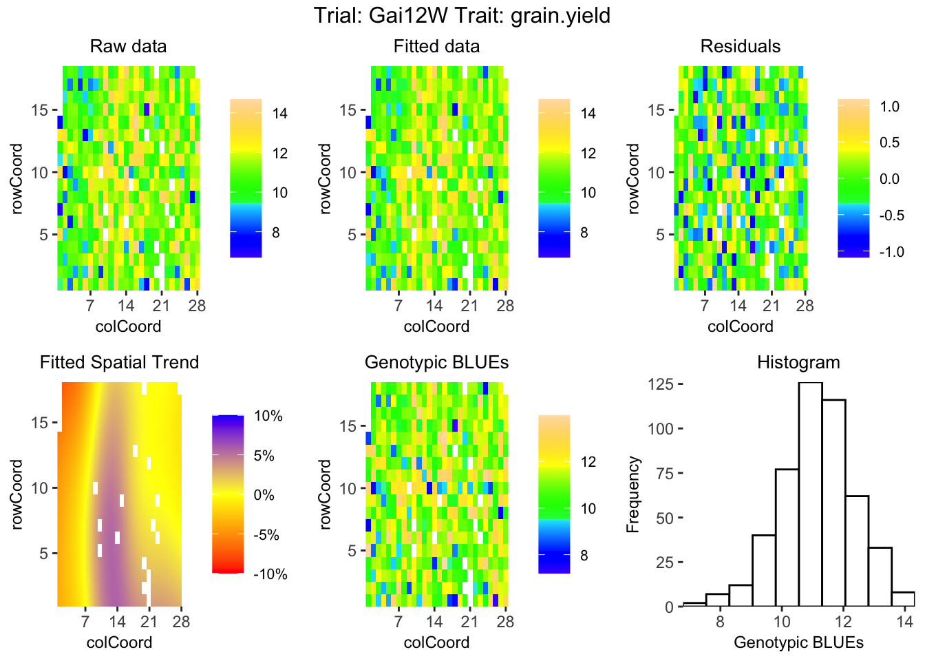 # 4. Ajustar el Modelo Mixto para un ensayo específico (ej. la localidad 'Gai12W')# ATENCIÓN: Para calcular la heredabilidad, el genotipo DEBE ajustarse como aleatorio (what = "random")# Usaremos 'SpATS', el motor espacial por excelencia para suavizar la heterogeneidad del campo.modelo_ensayo <-fitTD(TD = dropsTD, trials ="Gai12W",design ="res.rowcol", # Diseño fila-columnatraits ="grain.yield", # Rasgo a analizar: Rendimiento de grano# what = "random", # Genotipos como efecto aleatorioengine ="SpATS")## Spatial plot for the model with genotype fitted as fixed effect.## Display the spatial trend as a percentage.plot(modelo_ensayo, plotType ="spatial", spaTrend ="percentage")