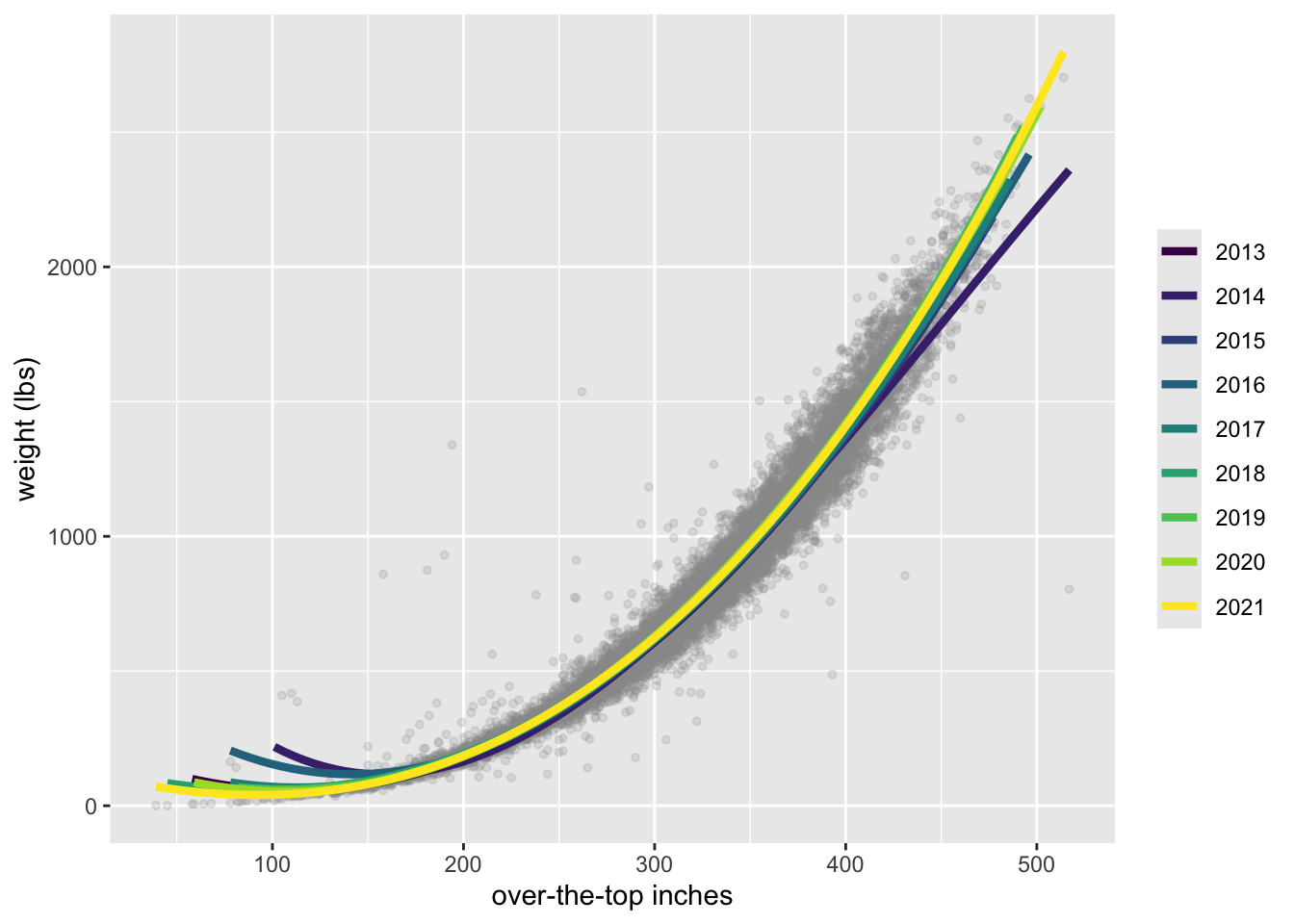 labs(x = "over-the-top inches", y = "weight (lbs)", color = NULL) +